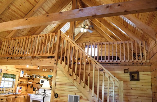 Enjoy your stay at the all new Mama Bear luxury Log Cabin. Sleeps up to six people. Fully equipped kitchen including Full size gas stove, microwave, toaster, coffee pot and refrigerator. Relax on the couch or reclining chair overlooking the stone gas fireplace and flat screen television with dvd/blu ray player and Dish network. Wifi included with your stay. Sleep well in the Mama Bear Log Cabins private bedrooms, the master includes a queen bed. Second bedroom is in the loft overlooking the living room fireplace, fitted with two queen beds. The cabin is tastefully decorated with bears and carries a rustic theme throughout. Enjoy the day or evening on the Mama Bear Log Cabins front porch and around the firepit, firewood is included with your stay.