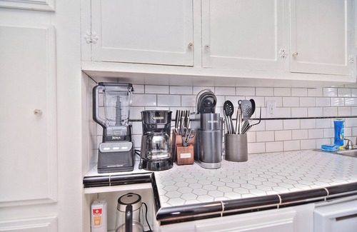The kitchen boasts a traditional drip coffee maker, with coffee and filters, as well as a Keurig and K-cups. You’ll also find sugar packets and creamer pods. There is also an electric water kettle.