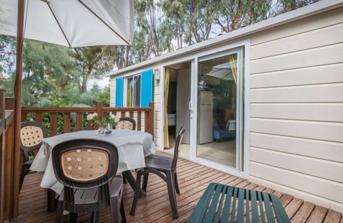 3-room mobile home 30 m2, on the ground floor. Practical furnishings: living/dining room with satellite TV. 1 double bedroom with shower/WC. 1 room with 2 beds. Kitchenette (Gas stove, 4 gas rings, kettle, electric coffee machine). Shower/bidet/WC. Electric heating, air-conditioning. Small terrace. Terrace furniture. Facilities: Internet (WiFi, free). Parking (1 car) at 100 m. IT049009B1GP3N4T2T