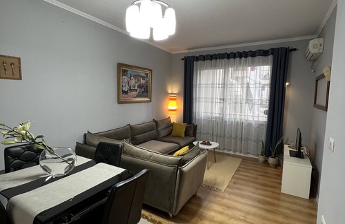 As you step inside, you'll be greeted by an authentic Albanian style that blends seamlessly with modern touches. The apartment features a comfortable seating area with a smart TV, a dining table, and a fully-equipped kitchen, making it easy to relax and unwind after a long day of exploring.