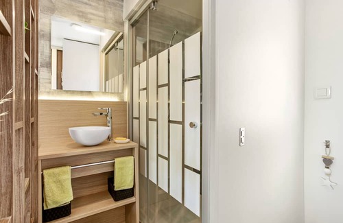 Boasting a beautiful view of the sea, the Mobil-home Taos with step-free interior is located in Saint-Raphaël. The 38 m² property consists of a living room, a fully-equipped kitchen, 2 bedrooms and 2 bathrooms as well as an additional toilet and can therefore accommodate 4 people. Additional amenities include Wi-Fi, a TV, air conditioning, a washing machine as well as a dryer. In addition, a table tennis table and gym equipment are available for your use. This accommodation does not offer: towels. This vacation rental has a private outdoor area with a 40m2 covered terrace and a plancha.