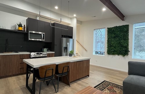 Welcome to your perfect getaway in the vibrant Pilsen neighborhood of Chicago! This stunning 2-bedroom home is the epitome of modern chic, offering an unforgettable blend of style and comfort. Designed for up to 6 guests, including a queen sleeper sofa in the spacious living room, the space is crafted with thoughtful architectural details and an eye for eclectic decor.