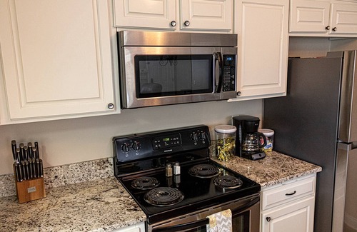 - Stainless steel appliances (refrigerator, stove, microwave and dishwasher) with granite countertops