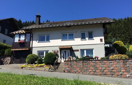 Located in a climatic health resort, the apartment is surrounded by scenic hiking and cycling trails, including the Rothaarsteig and Winterberger Hochtour. In winter, enjoy cross-country ski runs, toboggan slopes, and nearby resorts like Winterberg and Willingen. Excursion highlights include Kahler Asten, Hillebachsee, Fort-Fun amusement park, and the panoramic adventure bridge.
