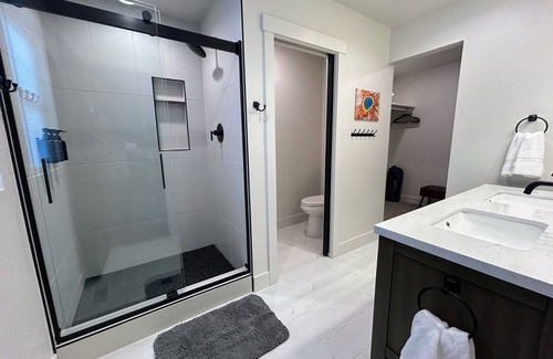 Upstairs, all three bedrooms offer mountain views, plush bedding, 55" Smart TVs, USB charging stations, and walk-in closets. The primary suite includes a spa-like bathroom with a custom tiled walk-in shower and double vanity—your own peaceful retreat.