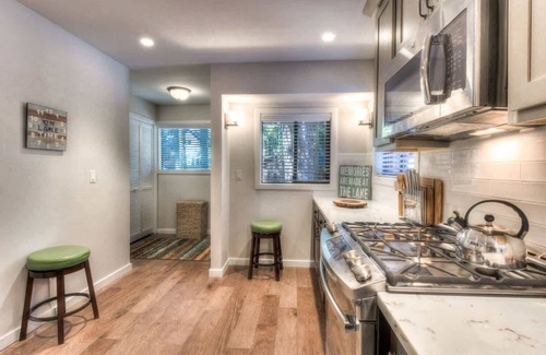 Once you are done exploring Tahoe for the day, relax in front of the stone-brick fireplace with your friends or family in the open-concept living room or outside on the back patio which comes equipped with furniture and a BBQ. The home is well equipped with games, puzzles, flat screen TV's (not pictured), and a DVD player. So get cozy and gather around with some hot cocoa! The kitchen is well equipped with a slow cooker, Keurig coffee maker and a drip coffee pot, wine ware, blender, utensils, and much more.