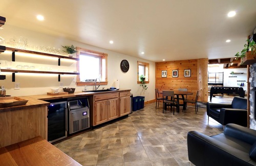 The lodge also has a 1,600 sq ft game room featuring a regulation Olhausen billiard table, ping pong table, foosball table, corn hole boards/bags, arcade with 60 classic games, wet bar with commercial ice maker and wine/beer fridge, fireplace, tv and lounge.
