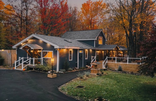 Outside, the expansive deck boasts a private XL hot tub that fits eight, seating, and a barbecue grill, perfect for outdoor dining and enjoying forest views. Explore the wooded grounds, gather around the fire pit, or enjoy nearby hiking trails, lakes, and ski slopes.