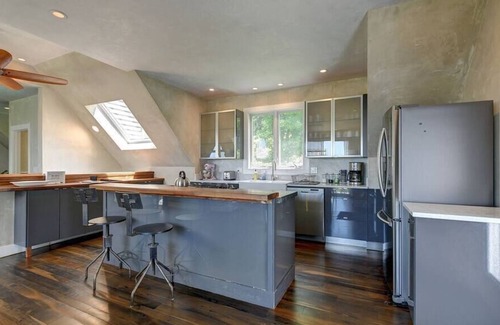 Built in 2009 by a local contractor and his artist wife this house has it all. The main floor which is accessed by a few exterior stairs near the driveway has an open concept kitchen with marble counters, dining room with seating for 6, a deck with outdoor seating for 6, comfortable living room with smart TV, 3/4 bath and huge bonus room with king bed, seating area, and work area overlooking the mountains.