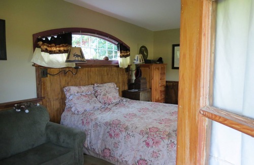 Mr. Ed’s Cabin is decorated in cowboy and western style with moose themed light fixtures, antiques and original artwork. The cabin has a front porch, an attached horse coral (horse is optional) and private fenced in garden. The Cabin is a studio and has a queen bed and a single pull out sofa, comfortably sleeping three. There is a kitchenette with a 3 burner cook top, below counter refrigerator, microwave and a large toaster oven. The bathroom has a small poured concrete tub in the shape of a barrel with wagon wheel shower head, toilet and vanity. Comfortable in the winter and summer the cabin has air Conditioning, heat, Direct TV and a DVD player. Mr. Ed’s is a perfect weekend getaway or long term rental for couples, small families and friends.