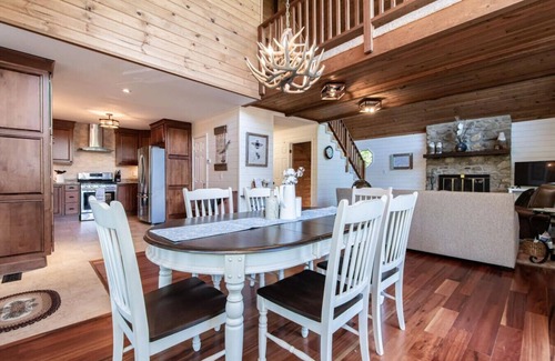 Upper Level master with King bed in enclosed bedroom and new full Futon on loft area. Full bath with all new tiled shower. Wake up to the view of the mountains and your own private balcony! Lower level has closed off bedroom with barn doors, twin over full bunk beds. Full bath with step in shower, living room/TV area, foosball table and various board games etc. Efficiency kitchen in basement with small appliances and equipped with the basics.