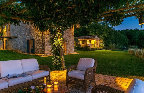 The 4000 square metres park that surrounds the house is full of luxuriant flowers and plants as well as many other vegetative species. The surrounding lawn is well maintained, perfect for those who love to feel the softness of fresh grass and its summer scents. Between the main building and the annex is a large stone-paved patio, with a pergola equipped with table and chairs where guests can enjoy alfresco meals and aperitifs. On the panoramic side of the property is another pergola where guests can relax with a good book during the afternoon. On a lower terrace is the swimming pool, visible from the house and in a panoramic position.Please notice that photos are taken in spring, therefore flower blossoming, and the colours of the gardens' grass could be different at the moment of your arrival at the villa.