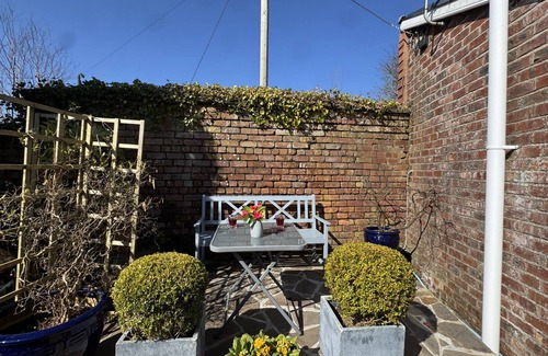 Outside : patio area with garden furniture and share of the main walled garden, which features a garden pond. Unrestricted parking just outside boundary wall. Owners asked to keep dogs on a lead in the garden