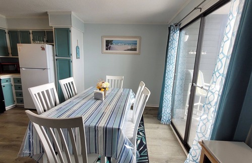 Self check in. Saturday to Saturday weekly summer rentals preferred. Must be 23 years old to rent at this resort. No pets allowed - Resort Policy. Ocean view from the balcony, living and dining area. Resort has indoor/outdoor pools, lazy river, tennis, pickleball, basketball, beachfront restaurant and bar. Full kitchen, 2 bedrooms (queen size/2 single beds) and two single bed ottomans in the living room.