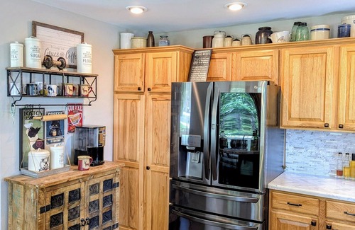 Centrally located in the Black Hills, our roomy and comfortable home has everything you need for a perfect getaway. Wake up to birds singing, squirrels chittering and watch the deer and turkeys feed in the front yard. Four outdoor gathering spaces, gas grill, flat top grill, fire pit, even a big screen television outside! Sit outside watching the Koi fish swim in the above ground pond. Large main floor living room and walkout family room. The kitchen boasts a gas range with electric oven, microwave, double dishwasher, smart refrigerator and dedicated coffee bar. Extra large island seats 10 people with additional seating on the deck located right off the kitchen. Four bedrooms, three bathrooms, extra deep soaker tub and large walk-in shower. Lower level sectional sofa and premium air mattresses provide additional sleeping for four people. Large grassy areas with ambient lighting allows you to enjoy outdoor games after dark. Plenty of parking and garage available for your vehicle and ATV. Located 2 miles from Sturgis, 20 minutes from Spearfish and Rapid City. Pavement runs up to location.