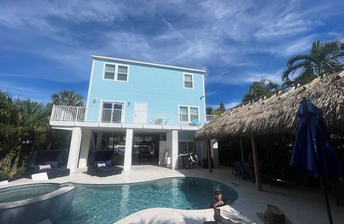 The Key West Blue Oasis House is a new construction 4BR/4BA+ (Sleeps 12+) retreat in the heart of Casa Marina/New Town district just minutes to the beach and Duval Street. The home opens to a secluded backyard with a heated pool, hot tub, lush tropical trees & gardens, a soothing waterfall, putting green and outdoor firepit... your own hidden paradise perfect for swimming, sunbathing or cocktails under the Tiki hut. It also features separate quarters with its own efficiency offering added privacy perfect for a Nanny or private chef traveling with your group. (Queen size futon) With its unbeatable location, resort-style outdoor living and exceptional privacy, The Blue Oasis House truly lives up to its name.