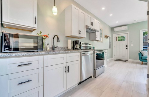 Stocked kitchen includes granite countertops, dishwasher, indoor round table with seating for four, and a stainless steel refrigerator/freezer. Also includes an electric stove/oven, microwave, toaster, tea kettle, dish set for 6, plenty of utensils, pots/pans, baking sheets, and cooking basics- such as oil, salt and pepper.