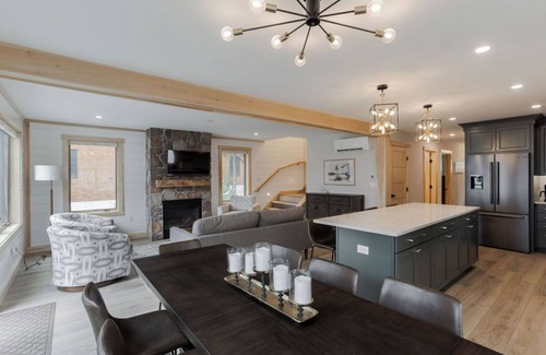 The main level features a handy mudroom to keep organized, Queen bedroom and bath with shower, laundry room, modern kitchen with eat in expansive granite island and brass fixtures, long dining table with views and a gas fireplace in the living room.
