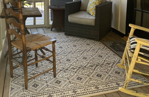 Comfortable outdoor seating with billowy curtains on the screened porch, a ceiling fan, and plenty of books to read, you'll wrap yourself in coziness and never want to leave!