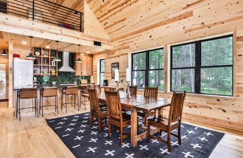 Camp Willewego has been impeccably appointed with contemporary elements and tasteful nods to vintage design and furnishings. The main entry welcomes guests into a bright, open concept living area with cathedral ceilings and floor to ceiling windows. Bathed in natural light with stunning views, there’s plenty of space to entertain, cozy up for a movie or challenge your guests to a game night. Head out to enjoy your morning coffee on the covered porch overlooking Big Saint Germain Lake, catching glimpses of eagles soaring overhead and deer meandering through the wooded lake front.