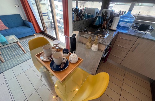 One-bedroom, one-bathroom apartment with a fully equipped kitchenette and balcony. One queen-size bed, one sofa bed, and one air mattress. Free covered parking in the building