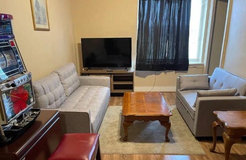 Totally Secure Building, All units inside Building(2nd Floor), VRBO and Short Term Rentals, Newly Remodeled One Bedroom Apartment, full Shower, Queen Size Bed, Foam Mattress, Dresser, Sofa Bad(Full), Full Living Room, 55” Flat Screen TV, HBO, Disney +, Netflix, Tubi, Wifi, Stove/Oven, Stand up A/C, Central Heating, Keurig Coffee Maker, Slot Machine, Refridgarater, Microwave, Double Sink, Dishes, and Silverware