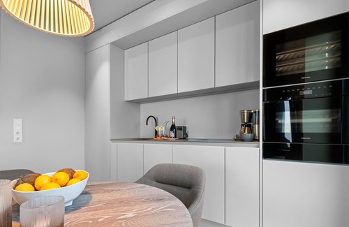 The heart of the apartment is the open living area, which is bright and inviting. The modern SieMatic kitchen is fully equipped with an induction stove, oven, warming drawer, and dishwasher. In addition, the kitchen includes a Quooker, making it easy to get hot water or sparkling water. For cozy evenings, a comfortable sofa area is available for spending time together or enjoying a movie on the Smart TV.
