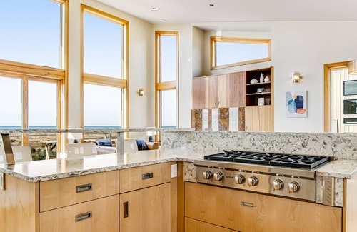 The oceanfront setting is enhanced by the home's plentiful windows, soaring ceilings, and sleek, contemporary style. The great room is encased in glass, offering a view straight out to the crashing ocean waves. Stream movies by the fireplace, set up board games at the dining room table, and prepare your favorite meals in a top-of-the-line kitchen (with a Sub-Zero fridge, a Wolf gas stove, a steam oven, and other high-end Wolf appliances).