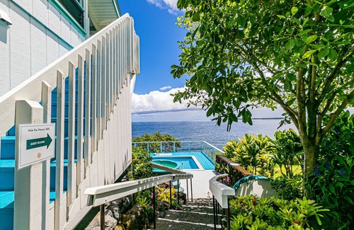 Hale Kai Hawaii Suites offers four oceanfront rooms (booked individually) and a spectacular, panoramic view of the blue Pacific Ocean and Hilo Bay. We overlook the popular Honolii surfing beach in a peaceful location just 2 miles north of historic Hilo Town. Revel in the best views in Hilo while at our pool and oceanfront lanai!