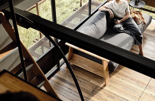 An exploration of maximum volume with a minimum footprint - the space offers bright and spacious living and dining areas with woodfire heating and a luxurious bluestone bathroom. The dreamy upstairs floor has all the requirements for your reading, studying, and resting. Featuring a light filled workspace overlooking the living area and a cosy private bedroom space with hanging storage and drawers so you can really settle in to life in space.