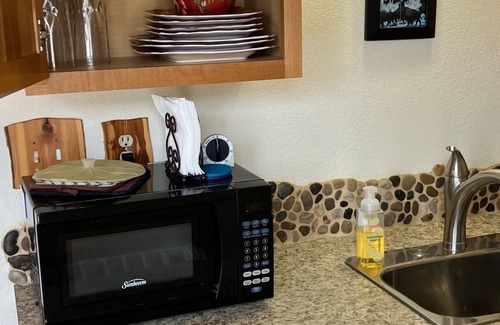 The kitchenette is thoughtfully stocked complete with a mini refridgerator/freezer, microwave, coffee maker, electric hot water pot, hot plate, pots and pans, silverware, cooking utensils, dishware, glassware, coffee mugs, tea, honey and spices. There is a convection oven/microwave combo to heat simple meals.