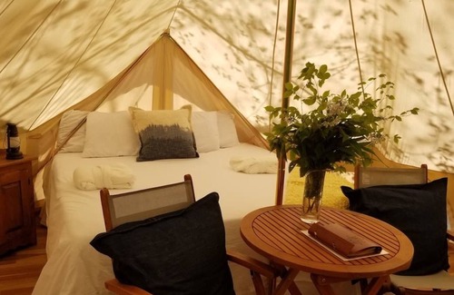 This safari tent is majestically perched on a huge deck overlooking a gorge with a small river flowing.You are surrounded by raw nature while comfortably snuggled into a little oasis of luxury. It is off-grid with a 12 volt power system and propane appliances. You have your own outdoor shower and outhouse. The town of Westport is 5 minutes away and Perth is 20. Pets are welcome. We now have a spectacular riverside wood-fired self-serve sauna to help you completely relax and disconnect!
