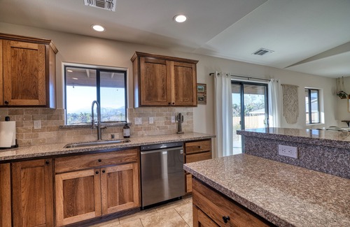 The home includes 3 queen beds, fully stocked kitchen and central AC and heating. The kitchen also includes a large refrigerator, gas stove top, oven, microwave, dishwasher, coffee maker, pots, pans, utensils, plates, mugs, glassware and grill tools are provided so that basic meals can be prepared. The pantry & fridge are stocked with basics such as condiments, tea, coffee, herbs & spices, etc. The kitchen is open to the dining room with a table that comfortably seats 4 with an upright bar and kitchen island that contains barstools.