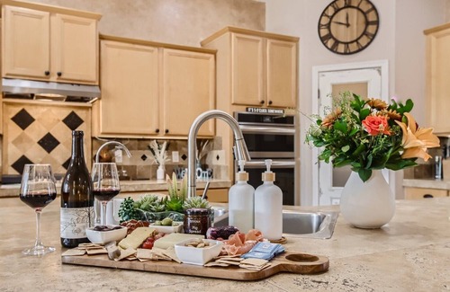 This gorgeous custom home offers 6 bedrooms and 4.5 baths on 3/4 of an acre located in a gated community in Glendale. You can choose from one king bed in the primary suite with a queen size sofa bed, 4 bedrooms with queen beds and the final bedroom includes a queen bed plus a twin over full bunk bed. You'll love preparing meals in the gourmet kitchen with brand new gas stovetop. The large open concept floorplan has options for the whole family!