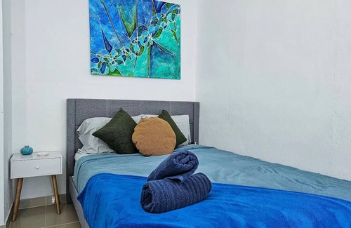 This apartment specifically is an Artsy Color blast, is the biggest one. It has 3 rooms with queen beds, two complete bathrooms. The living room area the backyard door have direct access to the pool and patio. The kitchen is completely equipped for family meals.