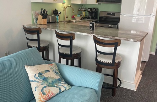 Exercise room with equipment and Tennis/pickleball Courts. Complex is oceanfront, condo is poolside. Kitchen is loaded with anything you will need for meals. Walking distance to the beach, great restaurants, entertainment , ice cream shop, coffee shop, and shopping. 1 mile to Publix groceries, Rucker John’s in Emerald Plan tation, water slide and much more!