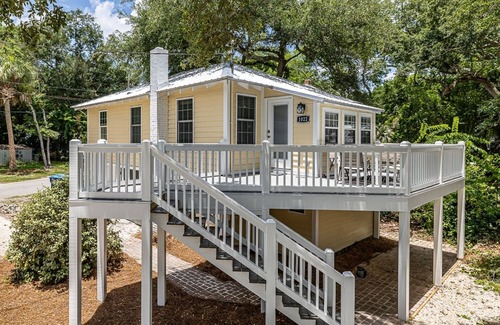 This pet friendly stand-alone cottage is the perfect place for a beach getaway! With the beach a block away and the village less than a mile, the fun is never ending! Hawk’s nest has 3 bedrooms and 2 bathrooms, patio with dining area, smart TVs in all rooms with complementary Hulu and Disney+, free on-site parking, communal grill area, and a shared outdoor shower area (located at adjacent blue house). We pride ourselves on Five Star quality, ensuring you will have an amazing stay!