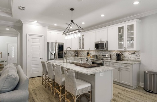 Let's talk kitchen, shall we? It's equipped with all the cool stuff – refrigerator with icemaker and water dispenser, stove/oven, dishwasher, microwave, coffee maker, dishware & flatware, blender, toaster, and the works. Indoors, there's entertainment galore Smart TVs (NO CABLE, Hulu live and streaming), And for some outdoor fun, dip into the private pool, show off your grill skills (BYOG - Bring Your Own Grilling game), or chill at the patio dining table. We've even got a spot with a fence for your four-legged pals, and yes, spotlights for extra flair!