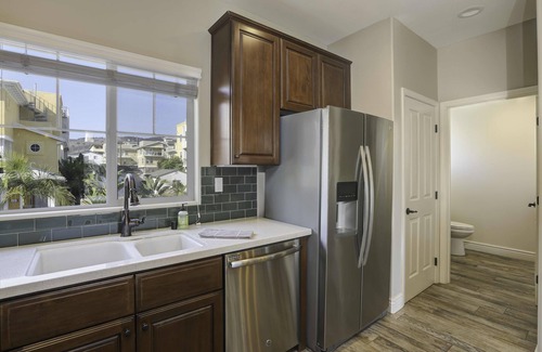 The second level is a spacious open living area. The living room has comfortable furnishings, sleeper sofa (queen), TV, dining table for 6, beautiful kitchen with chef grade appliances, and a convenient half bath. From the living area are large sliding doors that open to a balcony with a gas BBQ grill and bistro set. The balcony, overlooking Wadsworth Ave, offers ocean and downtown views.