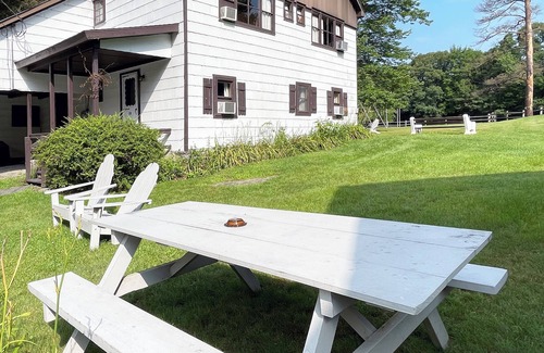 his first-floor apartment has beautiful hand-hewn beams, a flagstone patio with comfortable Adirondack chairs, and shade from a majestic willow tree. Located at the head of our nature trail, Apartment 19 is just a short walk from the lake.