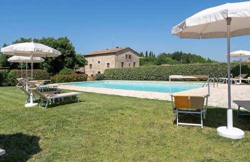 MAIN BUILDING: The main building is on three floors. The entrance is on the side facing the pool. On the ground floor there is a TV room, a fully equipped kitchen with large table, a room with wood oven, a delightful dining room, a bathroom suitable for the disabled, a sitting room with comfortable sofa's with fireplace and two bedrooms (with divisible bed) each with en - suite bathroom with shower. An internal stone staircase leads up from the reading room to the first floor; where there are three double bedrooms (with divisible bed) and a twin bedroom (with joinable beds) each with en - suite bathroom with shower. On the second floor, the only room accessible to guests is the laundry room. DEPENDANCE: The guesthouse located just a few metres away has two double bedrooms (one has dividable bed), two bathrooms with shower and a dining room with fully equipped kitchen. In a recently restored dependance, there is a living room with fireplace. Also at guests disposal are two splendid wooden gazebo's where are placed the table tennis and the table football.