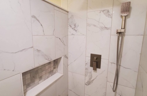 The bathroom is newly remodeled in 2022. It has a rain shower head as well as a handheld option. Salon quality shampoo/conditioner are available for your use. Body wash, soap, lotion, and a hair dryer are also stocked in the bathroom.