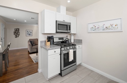 Upgraded 3 bed 1 bath, all new appliances and furniture, 3 min off R99, 10 min to airport, great access (70 min) to national parks (Yosemite, Sequoia, Kings Canyon, etc), close to stores and restaurants, fenced front and back yards, 100 MB high speed wifi, hardwood flooring, 65" TV w. Xfinity cable + Netflix, propane BBQ grill, all kitchen essentials including blender, coffee maker. 2 queen beds, 1 full-twin bunk bed and 1 queen sofa bed. 2 cars securely parked inside fence gate with lock