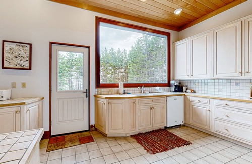Prepare family meals in an open kitchen with a center island and a full suite of appliances, including a French-door fridge. The cabinets are stocked with all the cookware and dishes you’ll need; even a waffle iron and blender are at the ready. A breakfast bar with three chairs provides a perch for morning coffee.