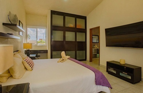 The property consists of one main house "Casa Eugenia " and one guest house "casita Miguelito ". Both can accommodate up to 8 people. Located in the heart of Corpus Christy neighborhood, just 3 minutes short walk to the waterfront. Near supermarkets, restaurants parks and movie theaters. The outdoor bar and grill is such a convenience for making your favorite Margarita or Mojito and in perhaps call a chef to cook and prepare for you and your group amazing authentic dishes. Enjoy large swimming pool 15 x 29 feet with constant depth of 5 feet. Night time is the most magical surrounded by tropical garden, dancing under the Cozumel stars, enjoying your family and friends. Almost every night there are interesting performances located by the municipal building and police which is 2 minutes walk from the house. Or perhaps would like to visit the museum of Art and browse the center square with light up fountain and many restaurants and shops.