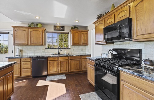 The upstairs features the perfect master retreat with a reading and kids play area in the the loft and a spacious master suite with a king bed, 55" Ultra High Definition TV, French Doors to a private deck looking to views and the beautiful backyard. The en-suite bath has a jetted tub, dual vanity and separate shower along with a large closet. On the main-level there are two guest bedrooms that share a bath. One bedroom has a queen bed. The other has bunk beds with a full size mattress on the bottom and a twin on the top bunk and twin day bed. Downstairs is a laundry room and second refrigerator, plus a game and TV room with a 65" Ultra HD TV, cozy recliners, game table and ping pong. Both of the TV's in the home have Roku built-in.. This home has a backyard oasis with grass, tiered flower gardens, fruit trees and berry bushes, built in charcoal BBQ and hardscaped patio areas and areas to explore around the 1 acre property.