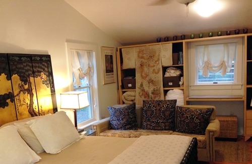 The 2 bedrooms feature a flexible set-up that can comfortably accommodate four, but can stretch to six with advance planning and available air mattresses. The extra large master bedroom (25' X 12') features a king bed (or two twins) with adjoining seating area, or it can be converted to large dorm-style room arranged with two twins and a single or double air mattress. A second bedroom features a queen bed with desk and seating. There is also a well-drained lawn if the kids want to sleep in their tent.