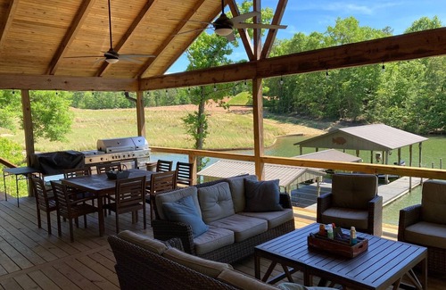 Amazing one level, spacious waterfront home built in 2018 with a great dock and swimming area. Home is a true open concept with the main living area being a 30' by 30' room including the kitchen (with large island), dining area that seats 10, a sitting area with two couches and two swivel chairs and a fireplace, and a pool table!!! All bedrooms are large including the "bunk room" with two trundle beds. One of the best features is a huge covered deck (30' wide by 20' deep) overlooking the lake that has a wonderful sitting area including two couches, two swivel chairs and a TV. Also on the deck is a dining area that seats 8 as well as a gas grill and a 36" Blackstone Griddle. So, you can easily seat plenty for meals between inside and on the deck. Also included is a laundry room that includes a large capacity washer and dryer and a commercial ice maker so you don't have to keep going to the store to buy ice. Now, to the best part, the waterfront that is only 20 steps from the house/deck. There is an oversized dock with mostly Trex decking and plenty of area to sit in the shade (with four ceiling fans) or in the sun, and to tie up your boat. Boats in photos and on the property are not included in rental. There are easy steps down into the water to swim and float including a large water mat. There is a bluetooth stereo on the dock so you can listen to your favorite music while hanging out on the dock or swimming. There is ample vehicle parking and a private boat ramp if you bring your own boat. We are very close to Chuck's Marina which has the best pizza on the lake and is very convenient to gas up your boat. We are flexible with check-in and check-out times. If nobody is in the place the day before your rental, you can request a check-in as early as 11:00AM. If we do not have a renter coming in right behind you, you can check out as late as 6:00PM. **Book through VRBO ONLY to protect yourself.
