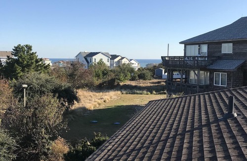 Located on one of the highest points in Duck. Enjoy fabulous views of the Ocean, Sound and surrounding area from our large wrap around deck. Beach access to the Ocean or Sound is just a quick stroll away! Approximately 350 yards to the Ocean, the access path is at the end of our street...and you do not have to cross the busy beach highway.