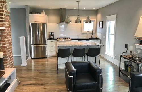 This home is newly renovated, very clean, in a quiet, private neighborhood, and has all the amenities you should need for your stay, including air conditioning. The main living space is a great spot to hang out, featuring a kitchen with an island. This area is open to the living. Dining at island or in garden.